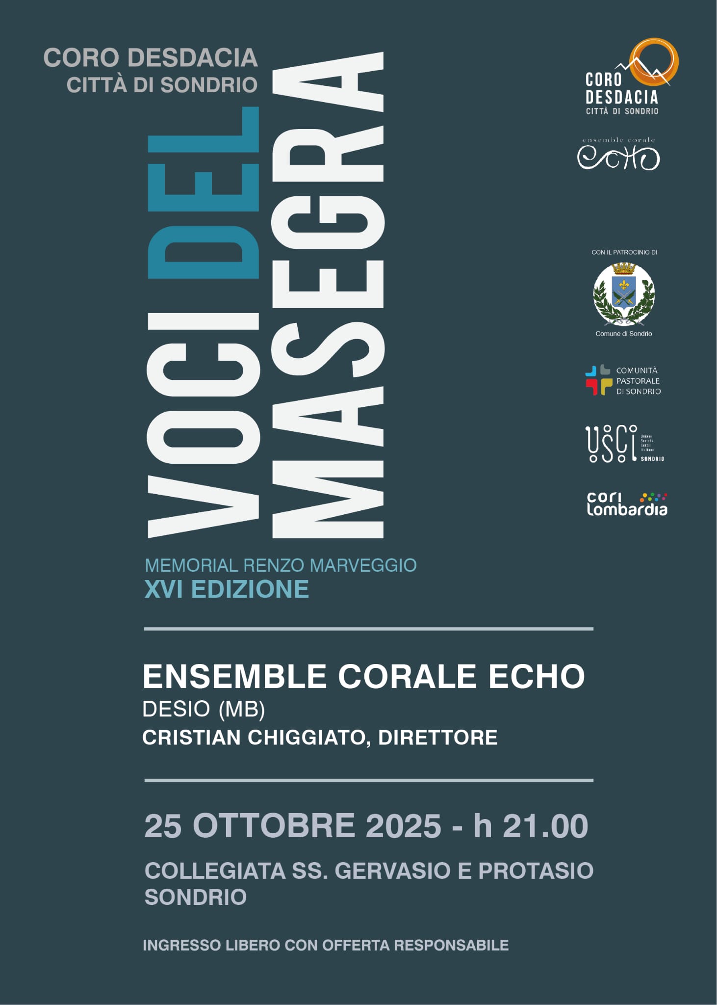 Lappuntamento a Voci del Masegra è fissato per sabato 25 ottobre p.v. nella Chiesa Collegiata dei SS. Gervasio e Protasio di Sondrio alle ore 21.00.