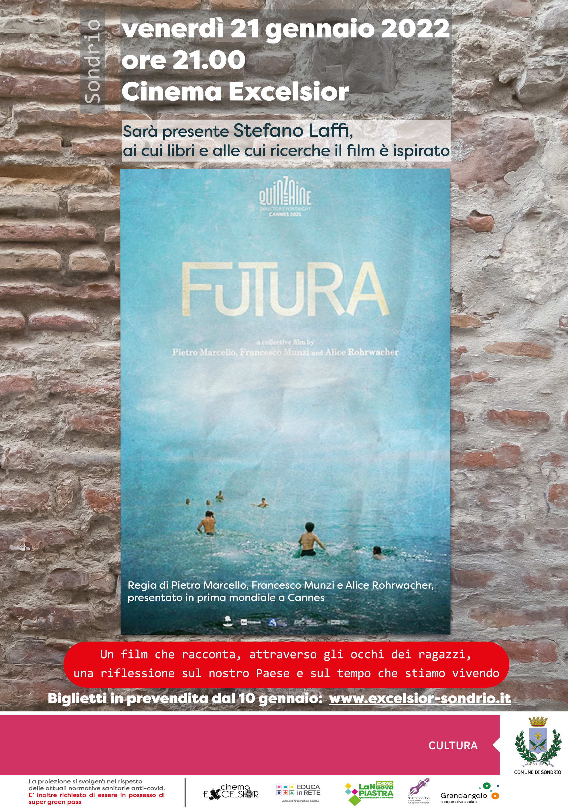 Nuova iniziativa per i giovani promossa da La Nuova Piastra, in collaborazione con Educa in rete e il Cinema Excelsior. Sarà infatti presentato il film "Futura" in Valtellina con l'obiettivo di creare nuovi spunti e strumenti di riflessione e azione nel lavoro con i giovani sul territorio. Il film verrà proiettato presso il cinema Excelsior il 21 Gennaio alle h 21.00.