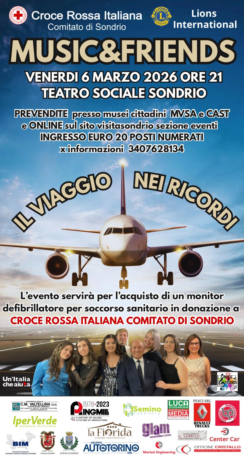 Quest'anno Music & Friends, in collaborazione con Lions Club e l'aiuto di altri benefattori, intende contribuire all'acquisto di 1 monitor defibrillatore di ultima generazione, per l'allestimento di una nuova ambulanza in dotazione a Croce Italiana Comitato di Sondrio, indispensabile per i soccorsi sanitari nel nostro territorio col principio che: FARE DEL BENE FA BENE!