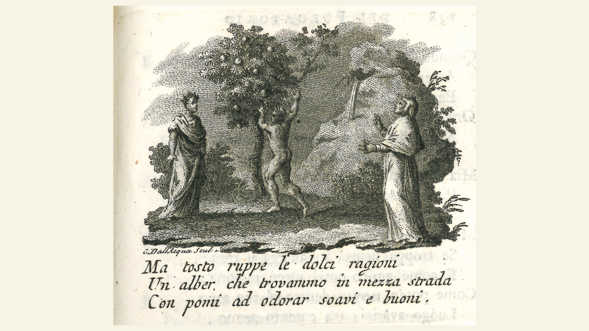 La strada che percorre la sesta cornice, in cui si sconta il peccato di gola, è interrotta da un albero dai cui rami pendono frutti dolcemente profumati. Stazio e Virgilio si avvicinano alla pianta, ma una voce li ammonisce a non toccarne i frutti